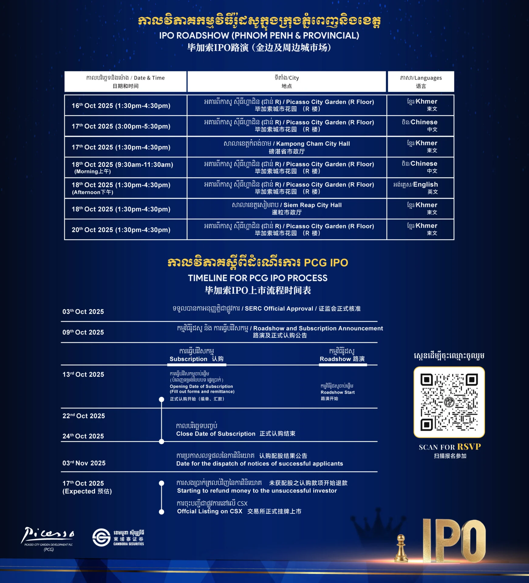 As PCG advances toward its public listing, the company warmly invites the public and potential investors to participate in the PCG IPO share subscription, contributing to Cambodia’s dynamic capital market. In addition, PCG will continue hosting IPO Roadshows in Phnom Penh and across various provinces, providing valuable insights and opportunities to engage directly with the company’s vision and growth strategy. Interested participants are encouraged to scan the QR code to register for upcoming roadshows or contact us via [012 286 220] for more information.
